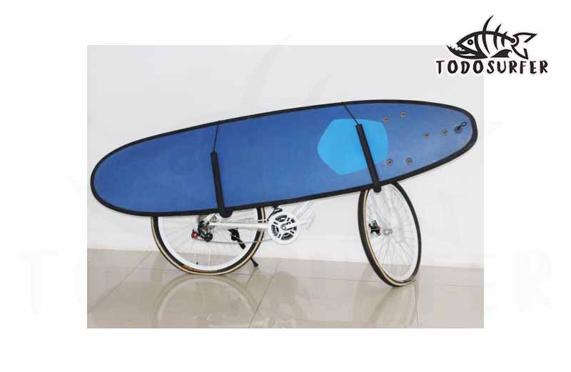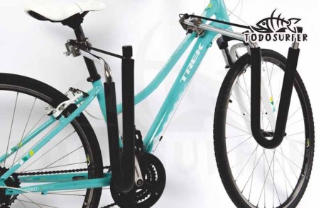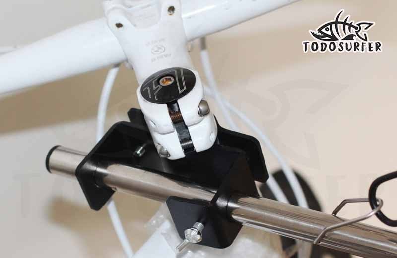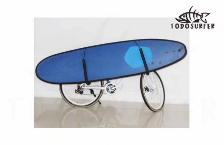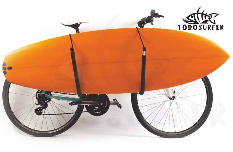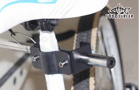 Soporte para acoplar bicicleta para llevar una tabla de surf. Realizado en acero anodizado con protecciones de goma. Soporta hasta 50 kg. Se puede acoplar de diferentes formas a la bicicleta. Incluye toda la tornillería.