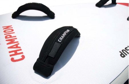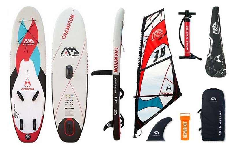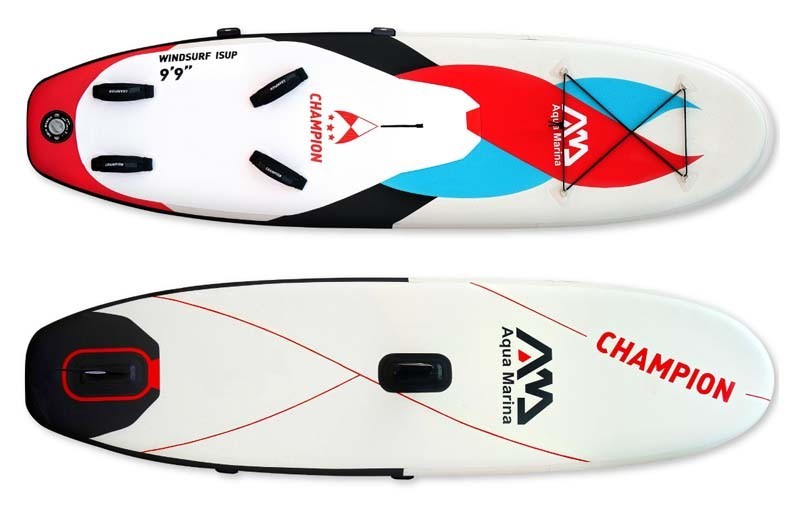 Esta tabla de windsurf Champion de Aquamarina inflable está fabricada con PVC de doble costura con tecnología DROP STICH, confiriendo una gran